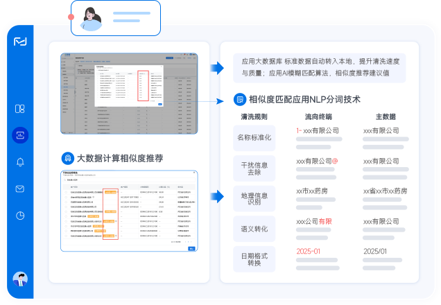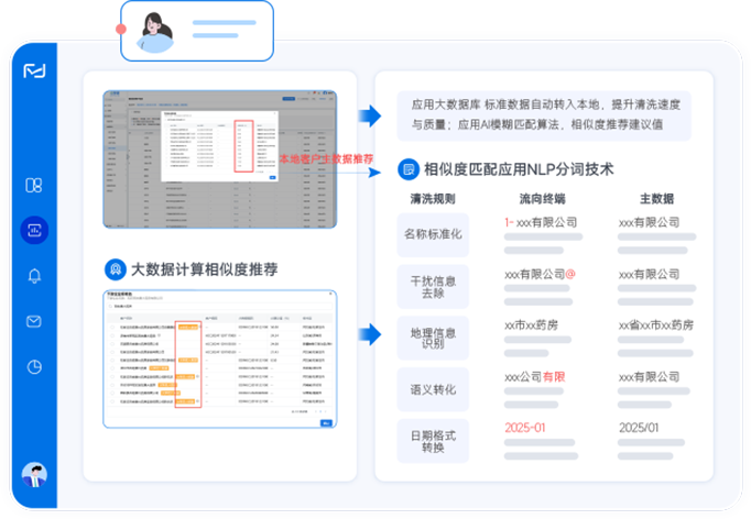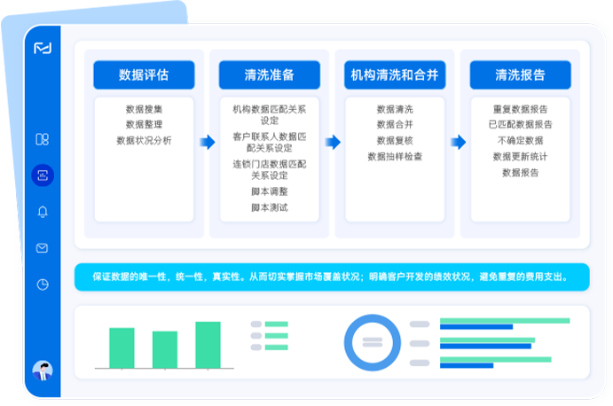 依数据评估、清洗准备、机构清洗合并输出报告流程,保障数据统一、真实,助企业掌握市场覆盖,明晰客户开发绩效,规避重复成本 。